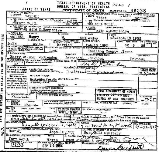 Harry W. McClendon's Death Certificate.