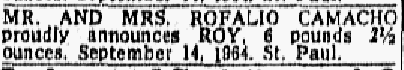 Roy Camacho Birth Announcement (Provided by Genealogybank.com)