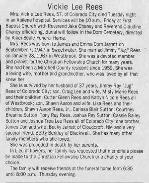 Vickie Rees Obituary (Provided by Newspapers.com)
