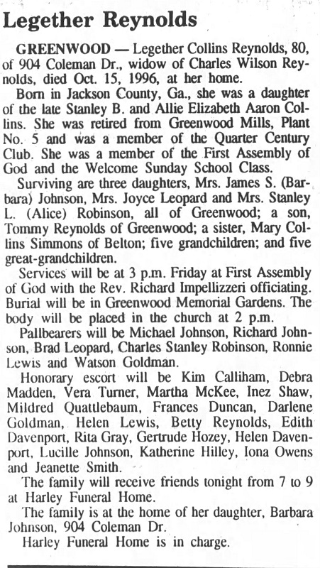 Mrs. Legether Reynolds Obituary (Provided by Newspapers.com)