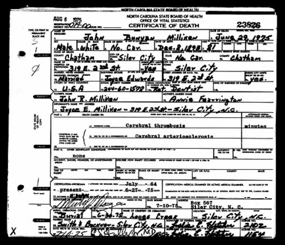 John B. Milliken death certificate (Provided by Ancestry.com)
