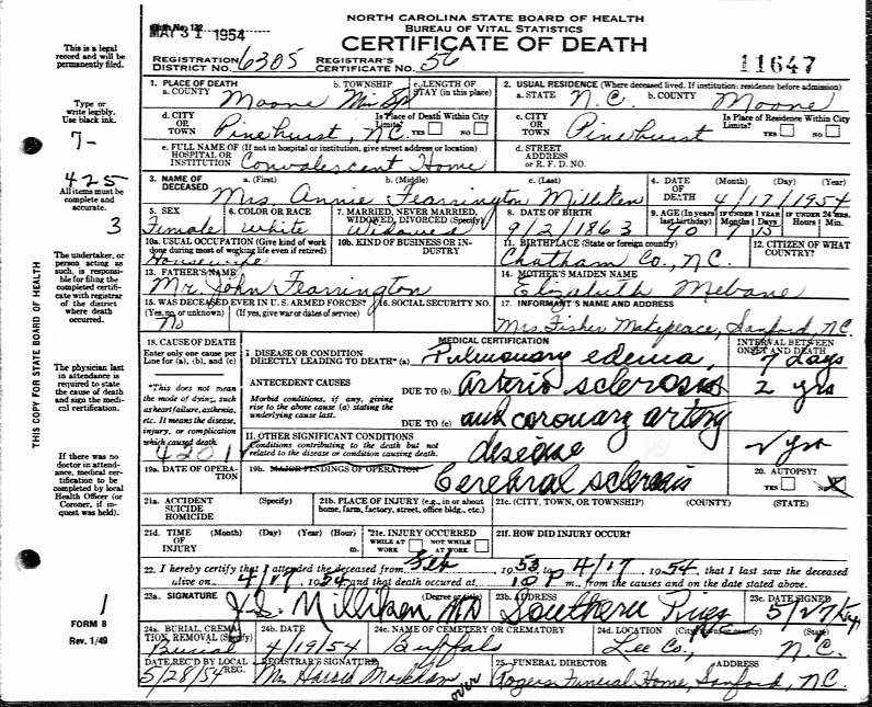Annie F. Milliken death certificate (Provided by Ancestry.com)