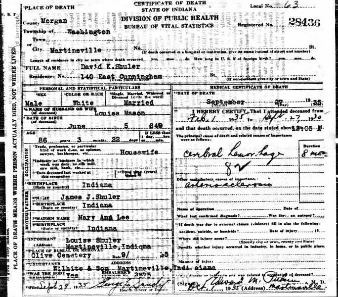 David K. Shuler Death Certificate (Provided by Ancestry.com)